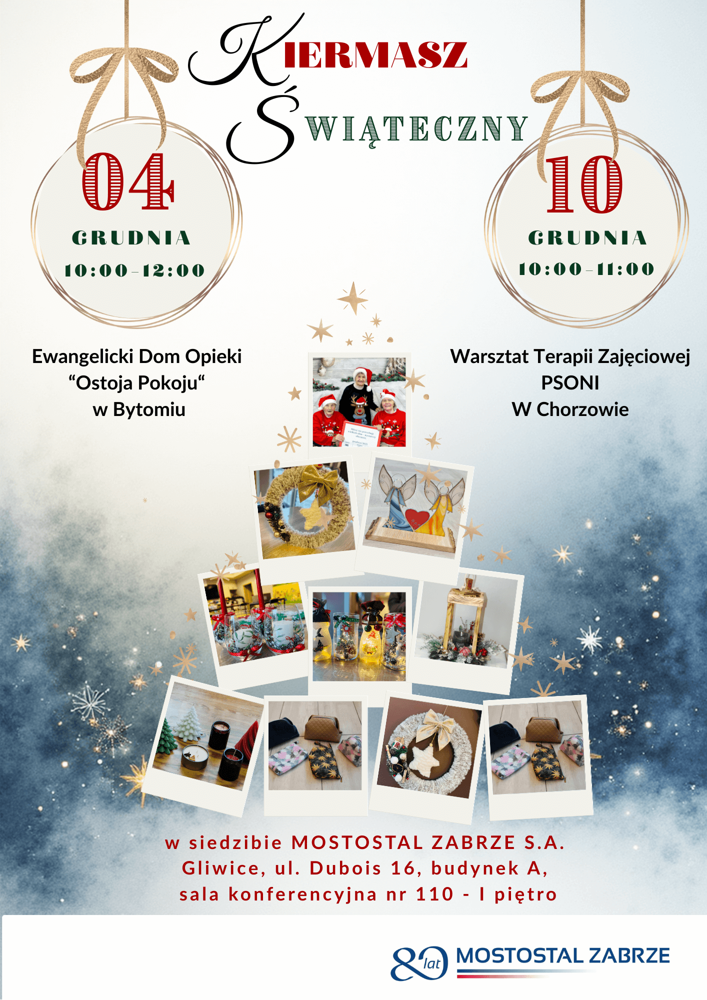 • 04.12., godz. 10:00–12:00, sala 110 – kiermasz we współpracy z Domem Opieki Społecznej – Ewangelickim Domem Opieki „Ostoja Pokoju” w Miechowicach,